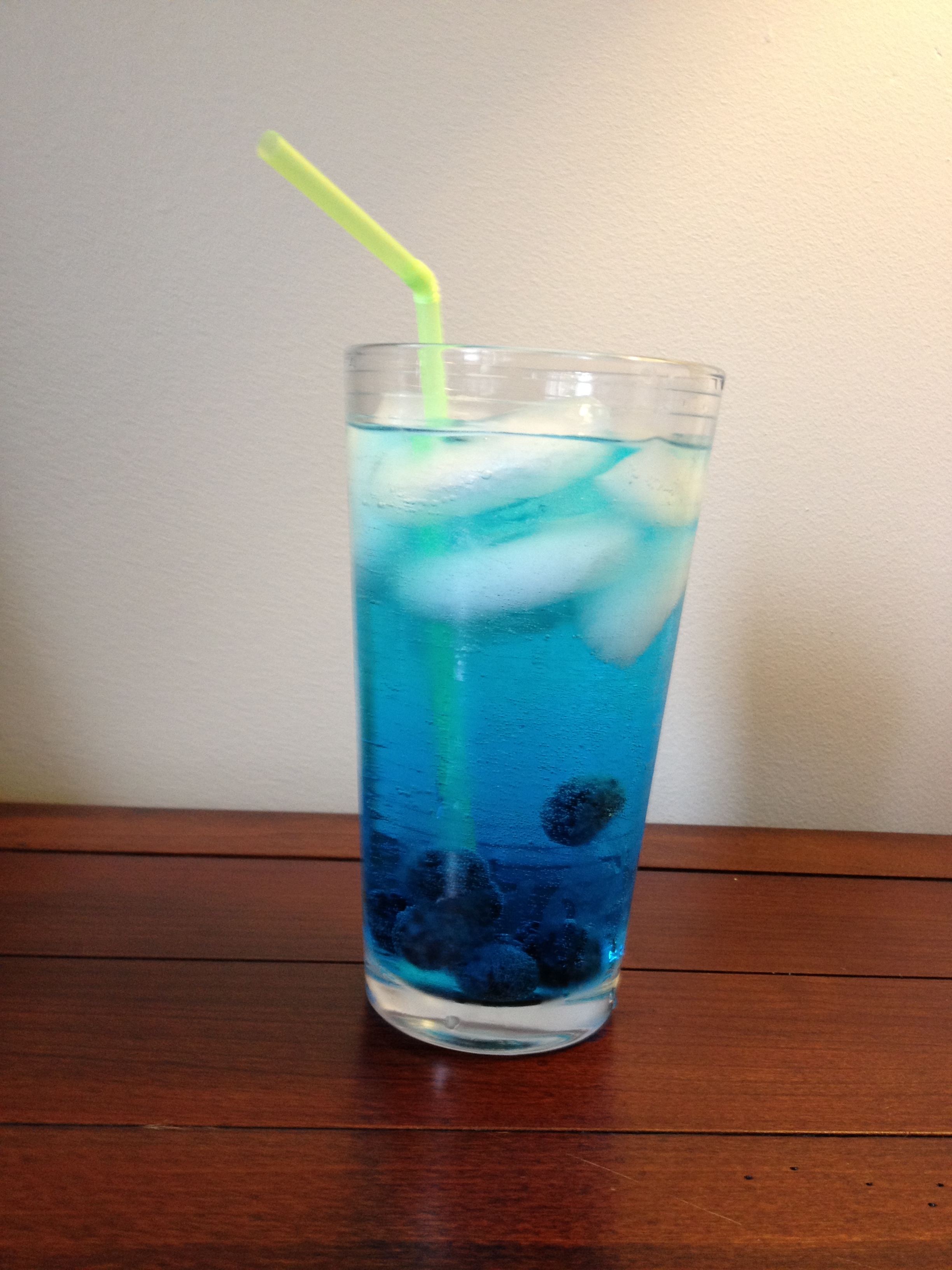 Add 1 cup of boiling water and blueberry tea bag. Let steep 2 mins. let sit in fridge or freezer until cold. Add 1 shot of tea 1 shot of Gin. Slowly pour 1 shot of blue curacao into glass. It will sink to the bottom. Pour in 2 shots of cold peach flavored water. Garnish with fruit.