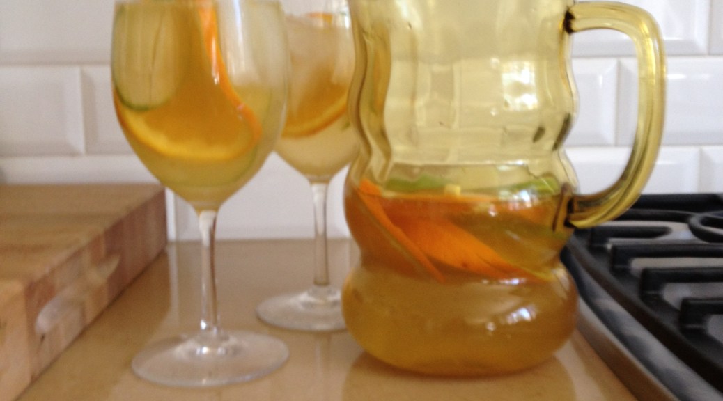 I know, I know, I haven’t been blogging. Now that the kid is back at school, I have more time to do the fun things. Such as, having an old fashion with a buddy of mine. We were discussing cocktails.  ( We had already discussed kids and spouses.) He told me the secret to his Sangria is Strawberry nectar.  Hmmm.   So I borrowed  his secret ingredient and ran with it.