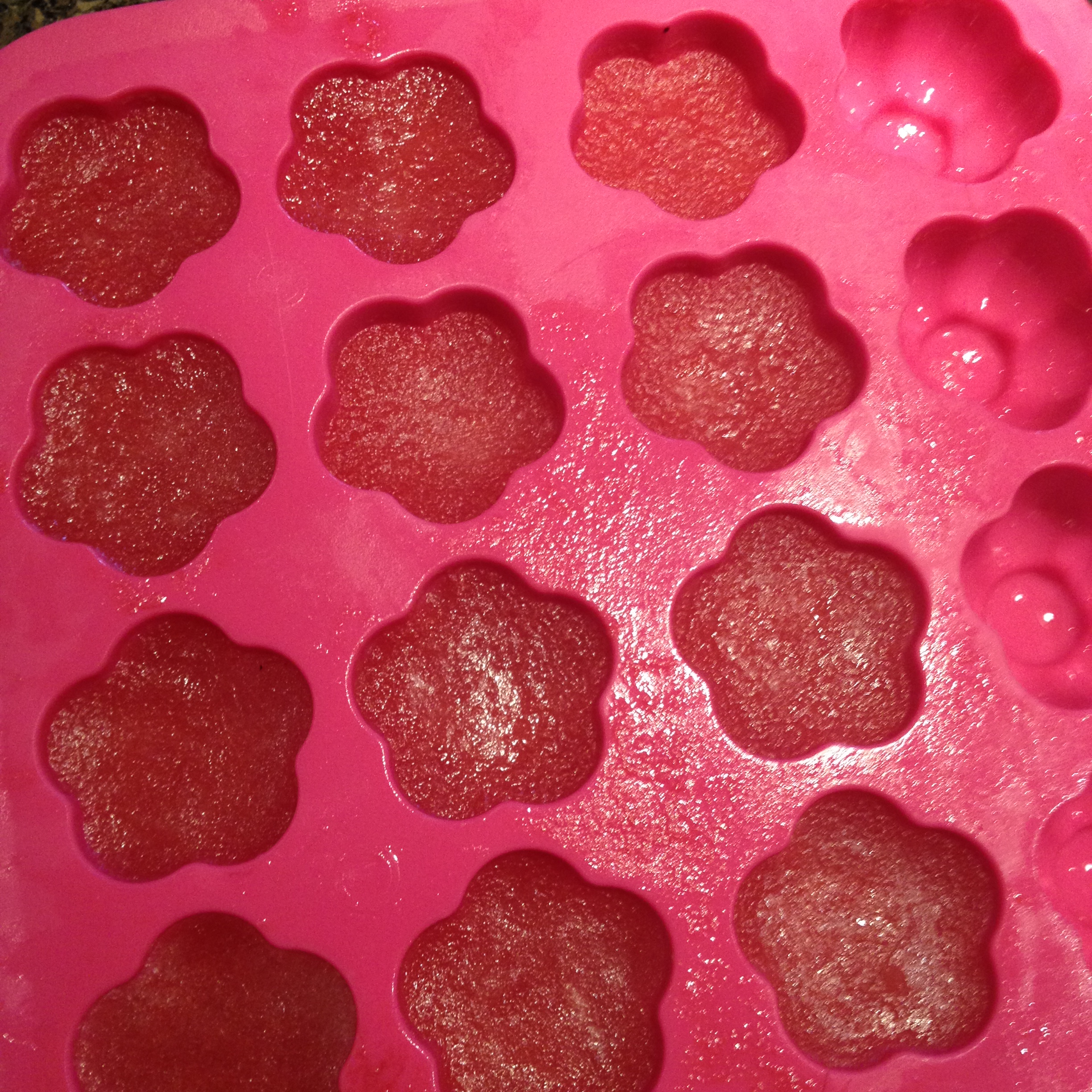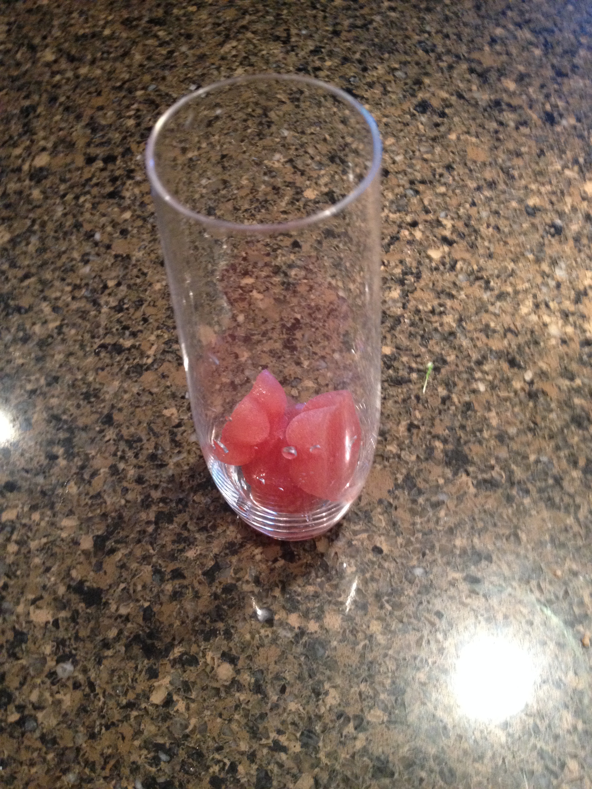 One of these little bowls held watermelon marinating in gin. Things I learned since then. Great photo, but a complete flavor failure. Watermelon does not infuse. I can’t waste anything so into the blender with extra watermelon and a few blueberries. I pureed and strained it. It tasted good. Couldn’t use it just then, I already had a watermelon drink for the week. I poured it into an ice cube tray and placed that in the freezer.